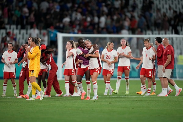 Canada team celebrates their side's 2-1 win at the end of the women's Group A soccer match between Canada and France at Geoffroy-Guichard stadium during the 2024 Summer Olympics, Sunday, July 28, 2024, in Saint-Etienne, France.Silvia Izquierdo/The Associated Press