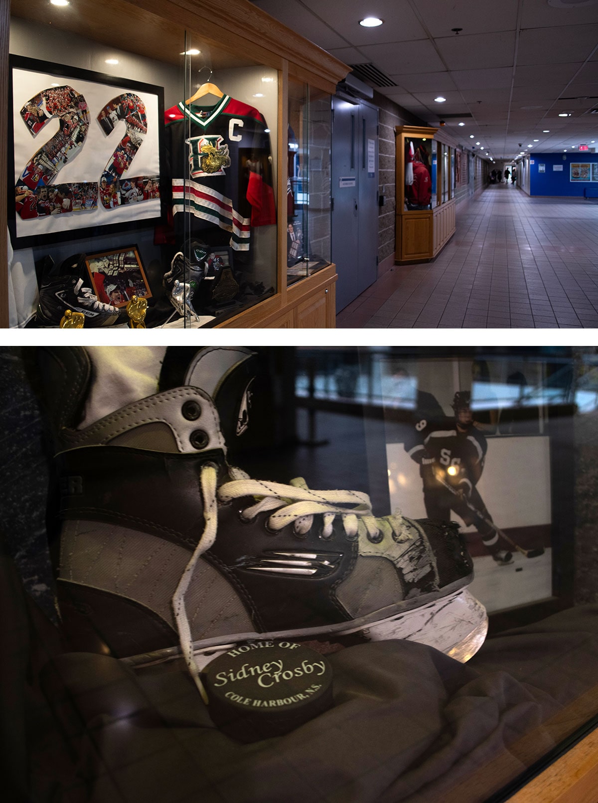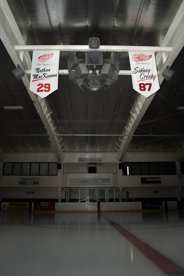 Banners hang from the rafters of Cole Harbour Place, signifying Crosby and MacKinnon’s time playing there.