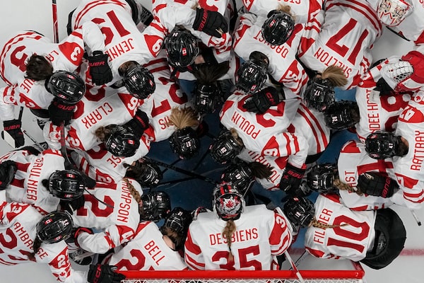 Canadian women's hockey players gather before a Feb. 14 game against Switzerland at the Beijing Olympics. They won the semifinal, advancing to a showdown for gold on Feb. 18.Petr David Josek/The Associated Press