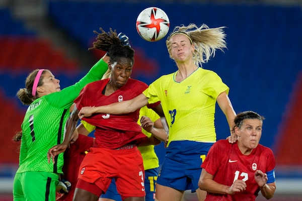 Sweden attacked early and earned a corner kick in the second minute, but Labbé punched the cross away. Canada’s first chance also came off a corner moments later, but a header by Vanessa Gilles sailed well wide.