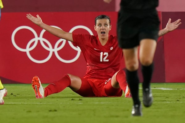 As the ball was fed into the box, Canadian forward Christine Sinclair was taken down by Amanda Ilestedt. The seated captain raised her arms in the air with an incredulous look at the non-call.