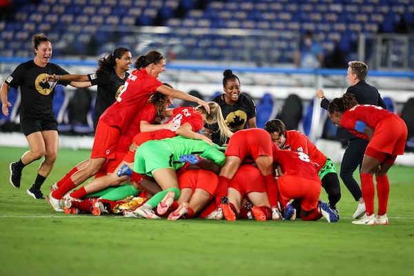 Canada women's soccer team celebrates winning the gold medal at the Tokyo Olympics.Melissa Tait/The Globe and Mail
