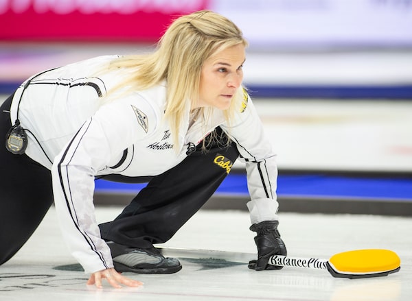 Skip Jennifer Jones watches a shot during a match against Team Fleury during the 2021 Canadian Olympic curling trials, in Saskatoon, on Nov. 28, 2021.Rick Elvin/The Canadian Press