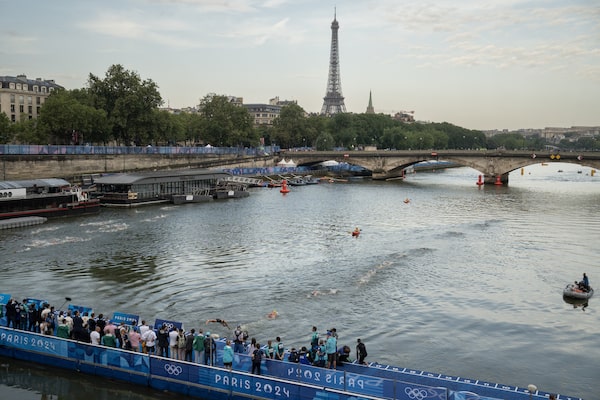 Open-water events are usually held in lakes and oceans, but the Seine River is the venue at the Paris Olypics. Competitors race in the Seine at the start the Women's Individual Triathlon in the 2024 Olympic Games in Paris on July 31.Siegfried Modola/The Globe and Mail