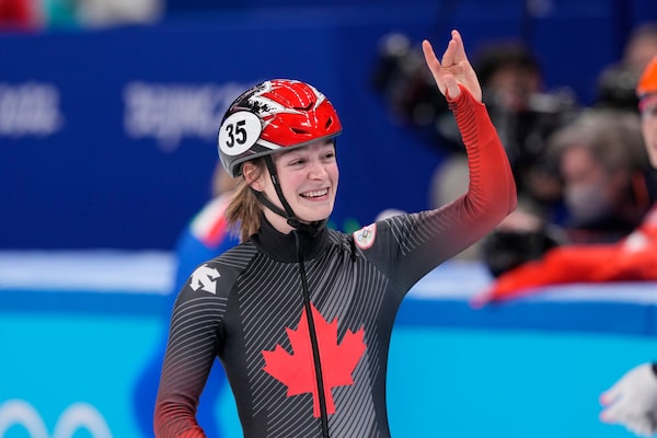 Canada's Kim Boutin reacts after winning the bronze medal in women's 500-metre short-track speedskating, in Beijing, on Feb. 7.Paul Chiasson/The Canadian Press