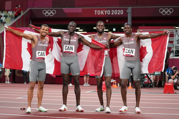 Canada's bronze-medal-winning 4x100-metre relay team celebrates with their flags after their race Aug. 6, 2021, at the Tokyo Olympics.Matthias Schrader/The Associated Press