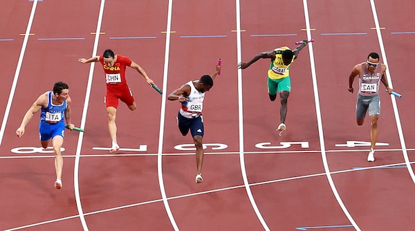 When De Grasse took the baton to run his anchor leg, Canada was fifth. He flew past the Chinese and Jamaican runners to the finish, bumping them off the podium. The Italians and Brits were too far ahead to catch.