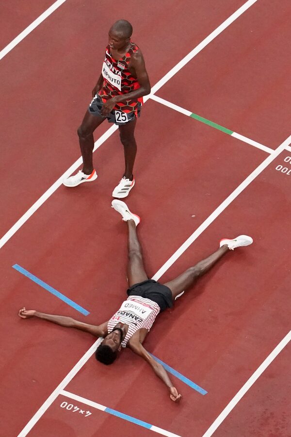Ahmed, who was eighth in the 10,000 at the 2016 Rio Olympics, knelt on one knee in the media interview area after the race. Because of COVID-19 protocols, reporters must stand two metres from athletes, and place their recorders on a small table, and so Ahmed generously knelt to speak directly into the recorders.