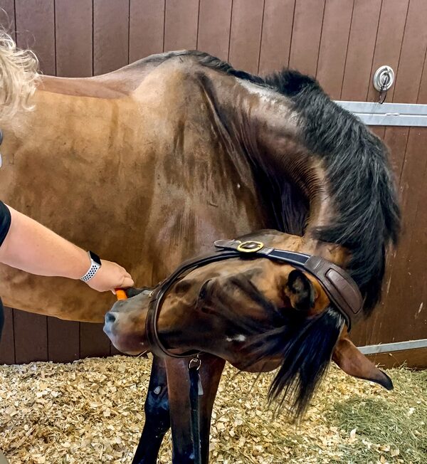 An expert in horse bodies, Knabe can gently create an effective neck stretch by holding a carrot at the horse’s side to encourage him to turn his head. That includes the Jessica Phoenix-ridden eventing horse Pavarotti, who the doctor calls the most flexible horse she has ever treated, one who can reach back nearly to his tail when seeking a carrot.