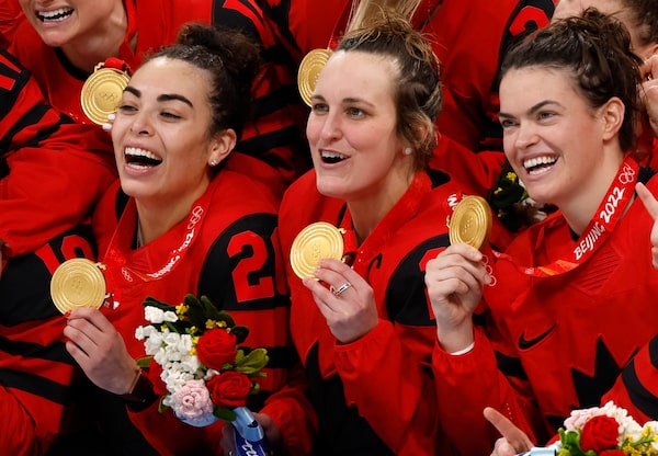 From the left, Canadian Women's Hockey team members Sarah Nurse, Marie-philip Poulin and Blayre Turnbull pose with their gold medals at the Wukesong Sports Centre, Beijing, China on Feb. 17, 2022JONATHAN ERNST/Reuters