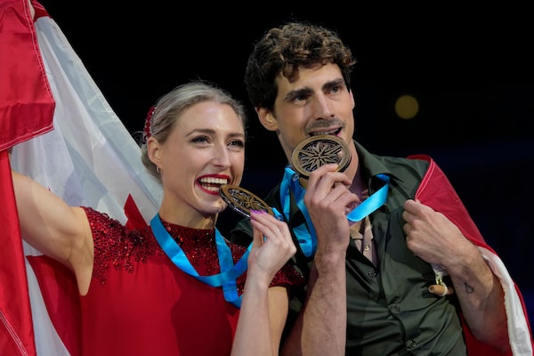 First place, Canada's Piper Gilles and Paul Poirier, pose during a victory ceremony after the Ice Dance Free Dance at the figure skating Grand Prix finals at the Palavela ice arena, in Turin, Italy, on Dec. 10.Antonio Calanni/The Associated Press