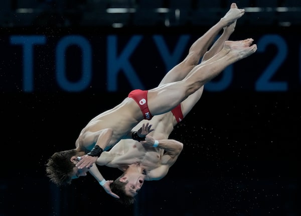 Vincent Riendeau and Nathan Zsombor-Murray of Canada compete during the men's synchronized 10m platform diving final at the Tokyo Aquatics Centre at the 2020 Summer Olympics.Dmitri Lovetsky/The Associated Press