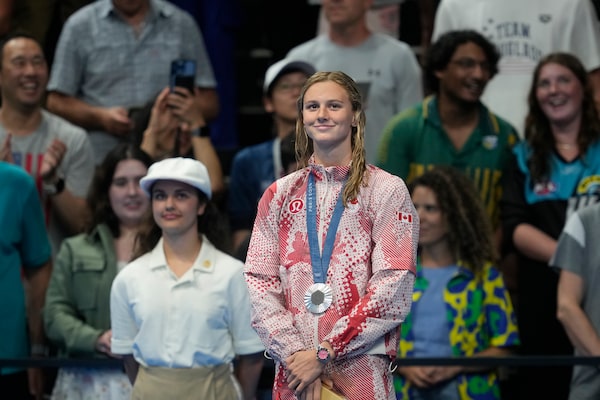 Summer McIntosh, of Canada, smiles as she receives her silver medal after the women's 400-meter freestyle final at the 2024 Summer Olympics.Adrian Wyld/The Canadian Press