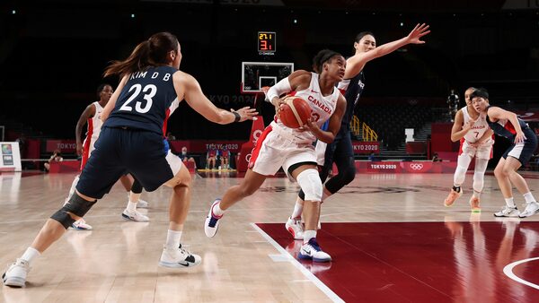 With no fans permitted due to Tokyo’s state of emergency amid rising COVID-19 cases, Canada’s chef de mission Marnie McBean, banging on a large drum, was a one-woman cheering section. Otherwise, the voices of players hollering directions were easy to hear over the squeak of sneakers.