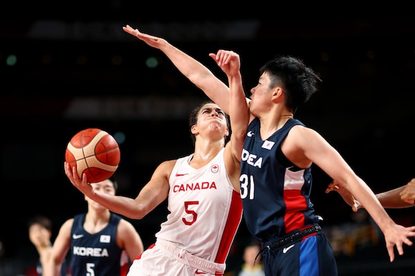 Laeticia Amihere of Canada in action at the rim with Park Ji Su of South Korea. Canada beat South Korea 74-53 on July 29, 2021.BRIAN SNYDER/Reuters