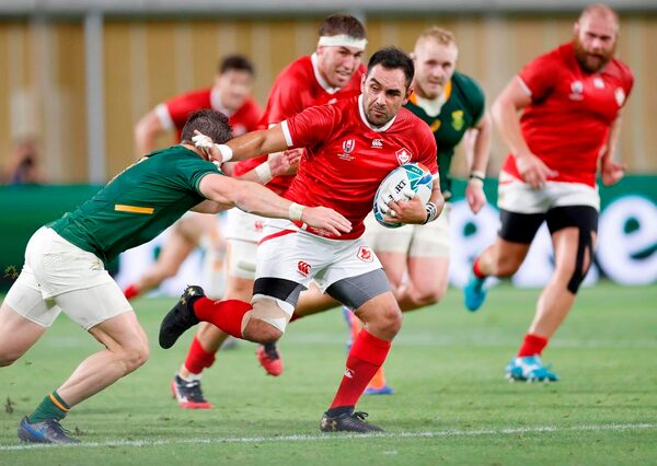 Canada's Phil Mack attempts to run past a South African defender during the Rugby World Cup Pool B game at Kobe Misaki Stadium between South Africa and Canada in Kobe, Japan, on Oct. 8, 2019.The Associated Press