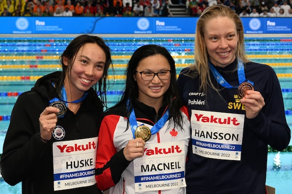 Maggie Mac Neil of Canada, centr,e Torri Huske of the U.S., left, and Louise Hansson of Sweden display their medals after the women's 100m butterfly final during the world swimming short course championships in Melbourne, Australia, on Dec. 18.Asanka Brendon Ratnayake/The Associated Press