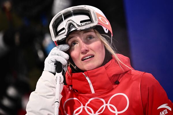 Canada's Justine Dufour-Lapointe reacts after her run in the freestyle skiing women's moguls final during the Beijing 2022 Winter Olympic Games at the Genting Snow Park A & M Stadium in Zhangjiakou on Feb. 6.MARCO BERTORELLO/AFP/Getty Images