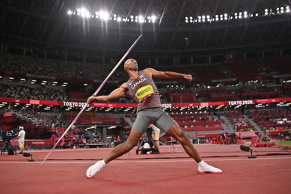 Damian Warner competes in the men's decathlon javelin throw during the Tokyo 2020 Olympic Games.BEN STANSALL/AFP/Getty Images