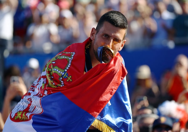 Serbia's Novak Djokovic poses with his goal medal during a ceremony at the Paris Olympics, on Aug. 5.Stephanie Lecocq/Reuters