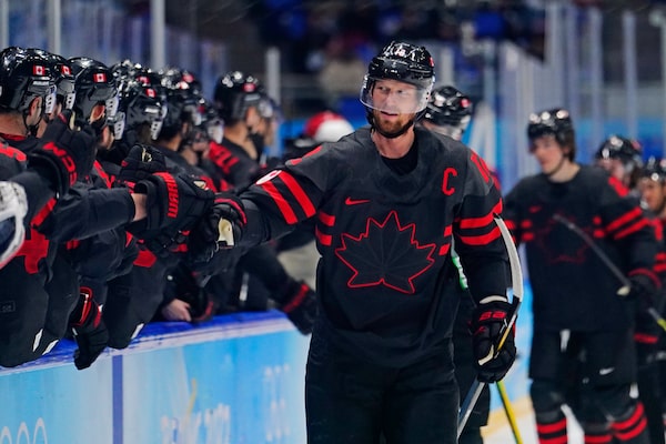 Canada's Eric Staal is congratulated after scoring a goal against China during a men's qualification round hockey game at the 2022 Winter Olympics on Feb. 15, 2022, in Beijing.Matt Slocum/The Associated Press