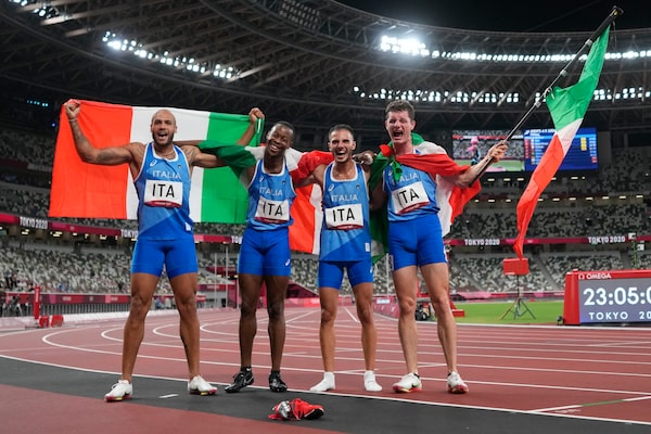 Team Italy celebrates after winning the men's 4x100-meter relay final at the 2020 Summer Olympics on Aug. 6, 2021, in Tokyo.Petr David Josek/The Associated Press