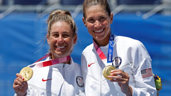 Gold medallists April Ross of the United States and Alix Klineman of the United States pose with their medals on Aug. 6, 2021.JOHN SIBLEY/Reuters