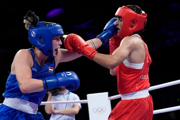 Algeria's Imane Khelif, right, fights Hungary's Anna Hamori in their women's 66-kg quarter-final boxing match at the 2024 Summer Olympics, Saturday, Aug. 3, 2024, in Paris, France.John Locher/The Associated Press