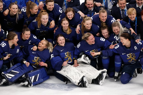 The Finnish women's hockey team poses for a picture after winning bronze at the Beijing Olympics, on Feb. 16.JONATHAN ERNST/Reuters