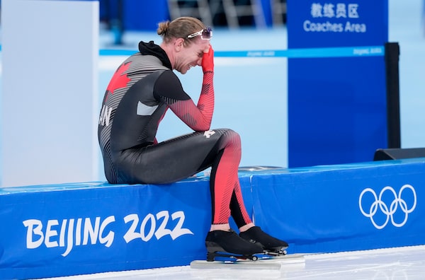 Canada’s Ted-Jan Bloemen wipes his face after competing in the men’s 10,000-metre speed skating race at the 2022 Winter Olympics in Beijing on Feb. 11.Paul Chiasson/The Canadian Press