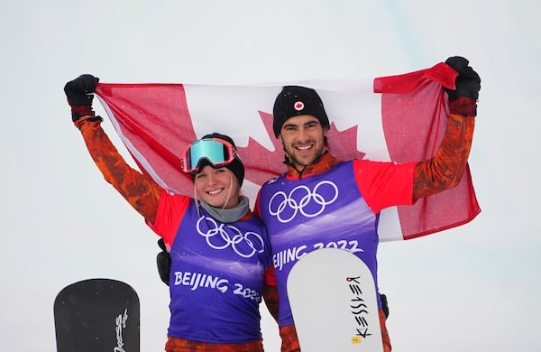 Canada's Meryeta O'Dine and Eliot Grondin celebrate their bronze medal in mixed-team snowboard cross at the 2022 Beijing Winter Olympics in Zhangjiakou, China, on Saturday.The Canadian Press