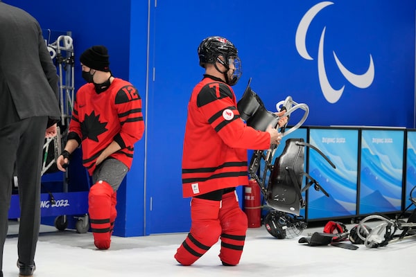 Canada's Zach Lavin, right, and Greg Westlake prepare for their para ice hockey semi-final match against South Korea in March, 2022.Dita Alangkara/The Canadian Press