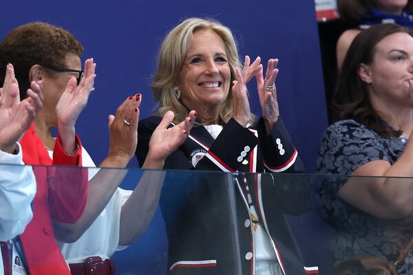 Jill Biden, First Lady of the United States watches the Women's Preliminary Round - Group B match between Team Greece and Team United States on day one of the Olympic Games Paris 2024 at Aquatics Centre on July 27, 2024 in Paris, France.Clive Rose/Getty Images