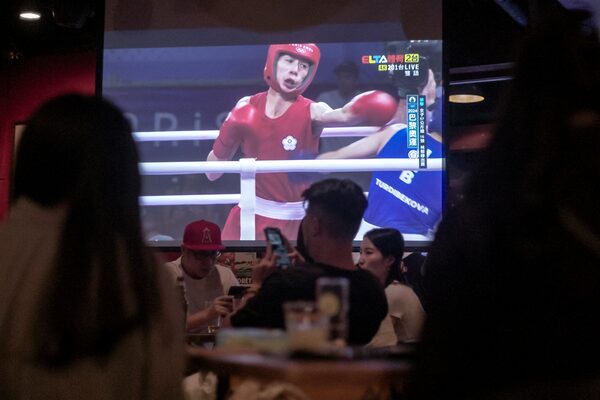 A screen shows Taiwan's Lin Yu-ting fighting against Uzbekistan's Sitora Turdibekova in the women's 57kg preliminaries round of 16 boxing match during the Paris 2024 Olympic Games, during a live telecast of Olympic Games at a sports bar in Taipei on August 2, 2024.SAM YEH/Getty Images