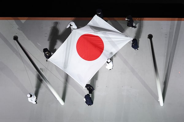 Japan's flag is carried onto the stage at July 23's opening ceremony for the Tokyo Olympics.FRANCOIS-XAVIER MARIT/AFP via Getty Images