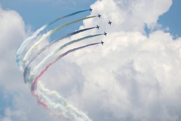 At top, Japan's Blue Impulse aerobatic team leaves smoke in the colour of the Olympic rings over Tokyo. At Shinjuku Gyoen National Garden, people turned out to watch the display.Thomas Kronsteiner/Getty Images; YASUYOSHI CHIBA/AFP via Getty Images
