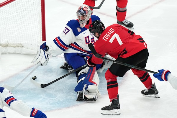 United States goalkeeper Connor Hellebuyck (37) uses his stick to block a shot by Canada's Devon Toews (7) during the third period of the men's hockey gold medal game at the Milan Cortina Winter Olympics on Sunday.Carolyn Kaster/The Associated Press
