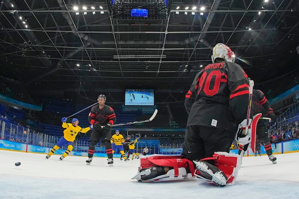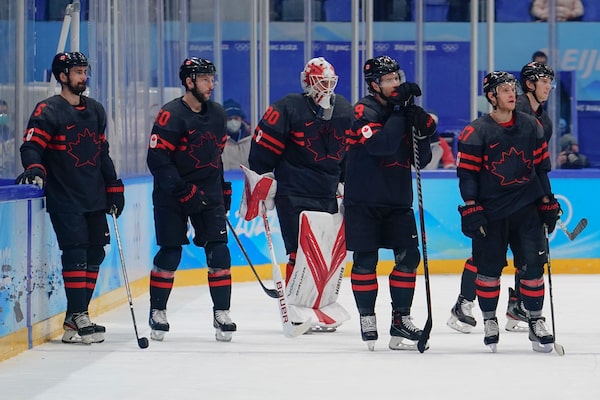 Team Canada players look on after a loss to Sweden at the Beijing Olympics, on Feb. 16.Matt Slocum/The Associated Press