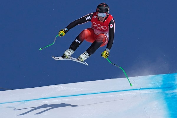 Canadian James Crawford makes a jump during the downhill part of the men's combined at the Winter Olympics on Feb. 10, 2022, in the Yanqing district of Beijing.Robert F. Bukaty/The Associated Press