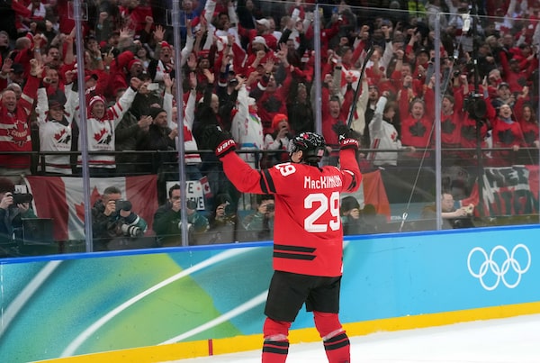 Nathan MacKinnon celebrates his winning goal against Finland win the Canadian fans in Milan on Friday.Nathan Denette/The Canadian Press