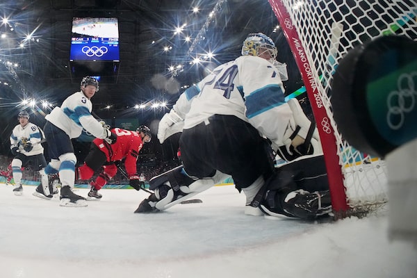 Juuse Saros of Team Finland gives up the game-winning goal to Nathan MacKinnon in the third period on Friday in Milan.Pool/Getty Images