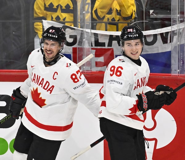 Sidney Crosby, left, got a feel for Celebrini's talent at last year's world championships. He went to bat for the young star in the summer, saying that the San Jose Shark deserved to be in the conversation when it came to choosing who would play on the Olympic team.Anders Wiklund/The Associated Press