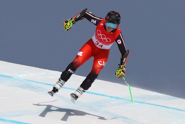Canadian Roni Remme makes a jump during the women's super-G at the Winter Olympics on Feb. 11, 2022, in the Yanqing district of Beijing.Alessandro Trovati/The Associated Press