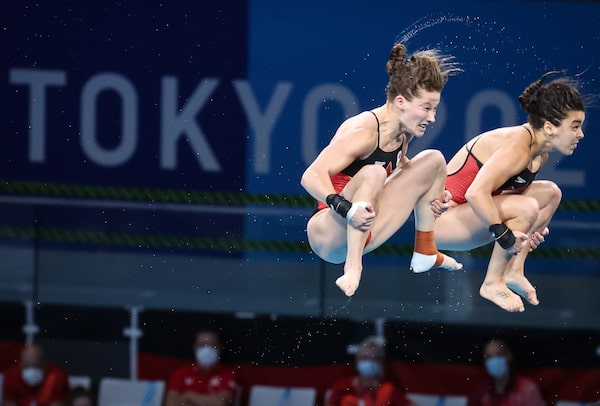 Canadian divers Caeli McKay, left, and Meaghan Benfeito compete in the women’s synchronized 10-metre platform at the Tokyo Olympics on Tuesday.Melissa Tait/The Globe and Mail