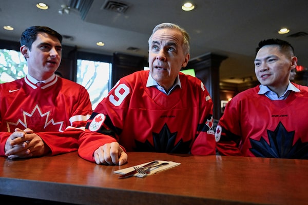 Prime Minister Mark Carney wears a Poulin jersey at a watch party in Burnaby, B.C.Jennifer Gauthier/Reuters
