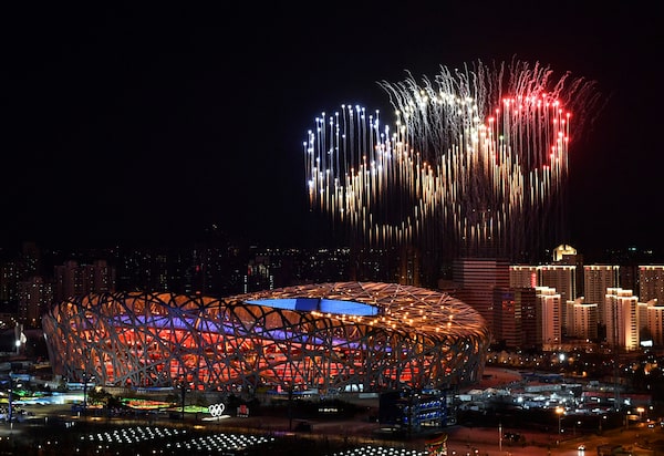 Fireworks, forming the Olympic rings, illuminate the sky during the opening ceremony of the 2022 Beijing Games, on Feb. 4.Li Xin/The Associated Press