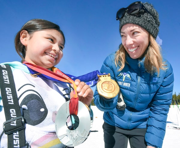 Former Canadian Olympian Beckie Scott talks to a participant from the Spirit North program, which is a program run by Scott for Indigenous youth to use sports and play to improve social and economic outcomes.The Canadian Press