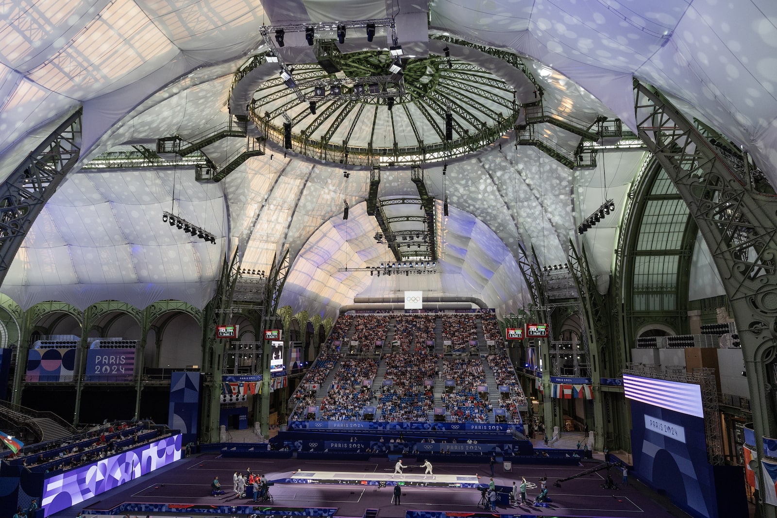 Fencers stand in an en garde position at the start of a bout at the Grand Palais in the 8th arrondissement of the City of Lights, between the Champs-Élysées and the River Seine. Built in the late 1800s, its dome-shaped vaults of glass and steel elegantly dominate the skyline of the French capital. Spectators here enjoy the grandiosity of this venue, which was built to showcase art and technology, as their athletes compete for the podium.