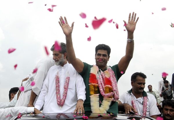 Olympian Arshad Nadeem waves to people outside his village in Mian Channu, Khanewal district, Pakistan, on Aug. 11.The Associated Press