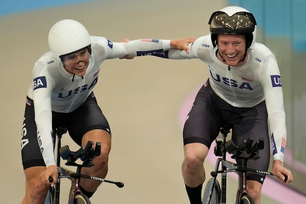 Americans Kristen Faulkner, left, and Lily Williams celebrate winning the gold medal in the women's team pursuit event, at the Summer Olympics on Aug. 7, 2024, in Paris, France.Ricardo Mazalan/The Associated Press